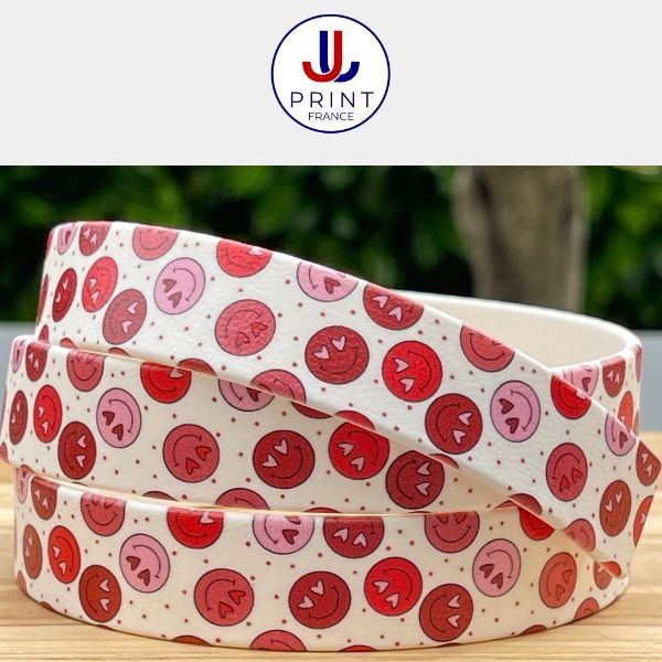 Créez des accessoires haut de gamme grâce à notre Biothane® imprimé en UV avec ce motif exclusif LOVE SMILEY